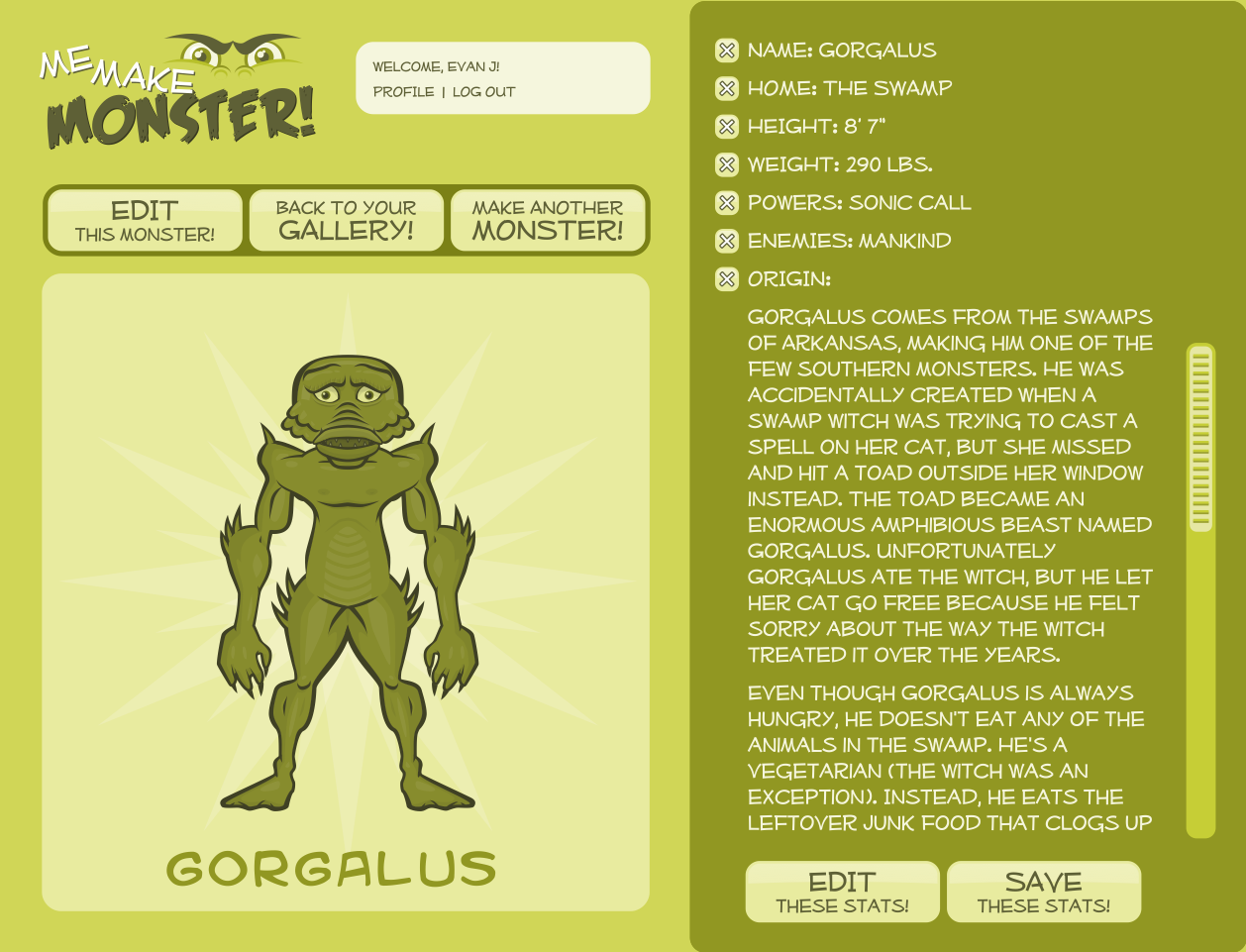 Monster-making web application. Users create a custom monster, modifying body parts, colors, textures, and additional elements.