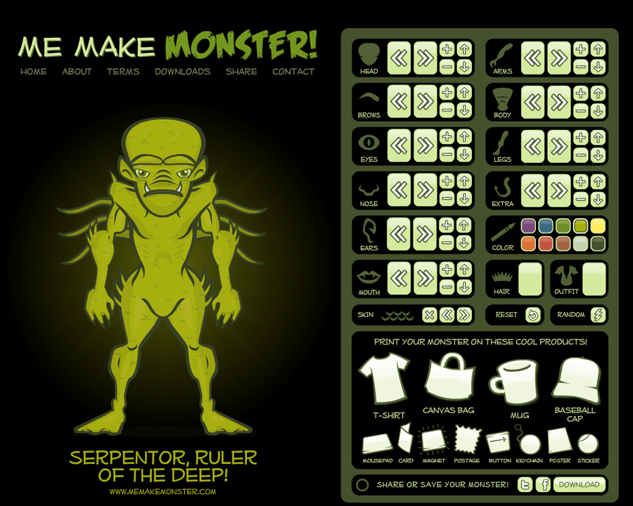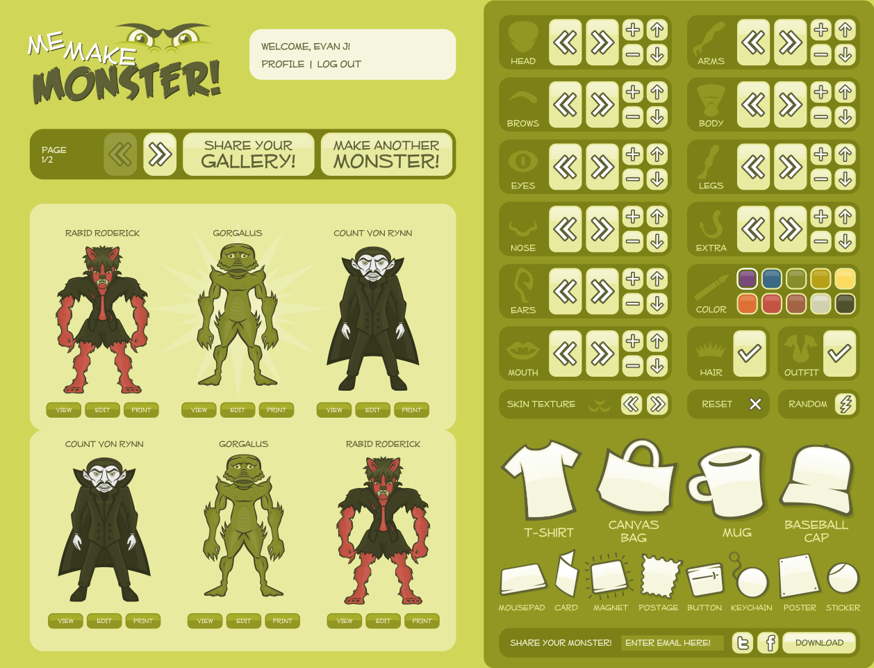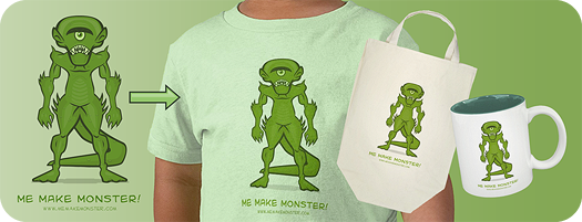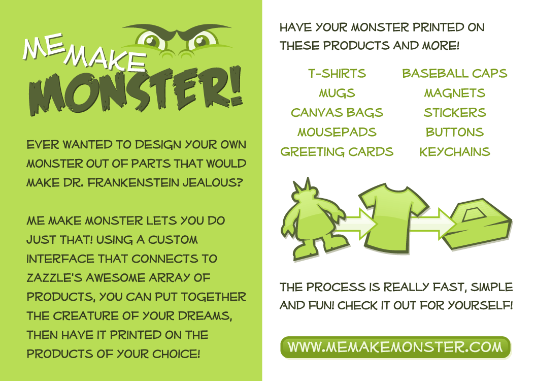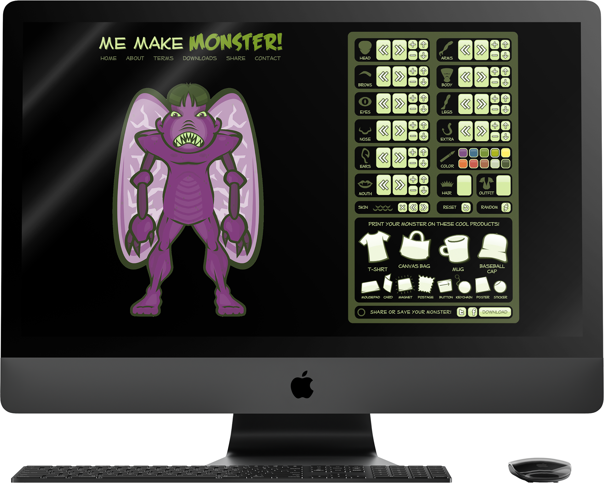 Once complete, the final monster is uploaded to a third party site where the image becomes available for printing on t-shirts, hats, mugs, and other products that users are able to order.