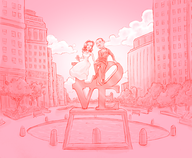 Illustration for a couple's wedding invitation. The final piece was adapted and used on invitations, place settings, a wedding website, and thank you cards.