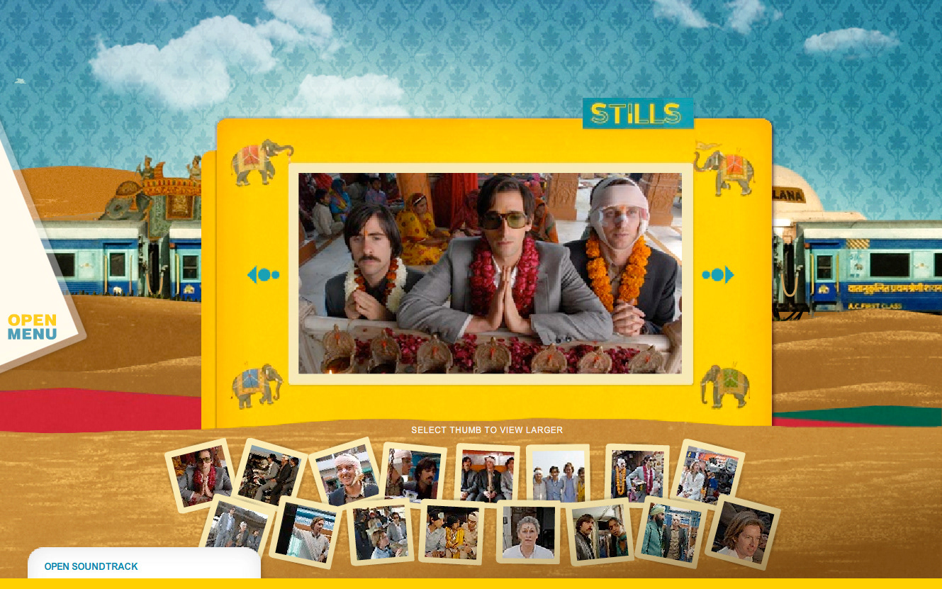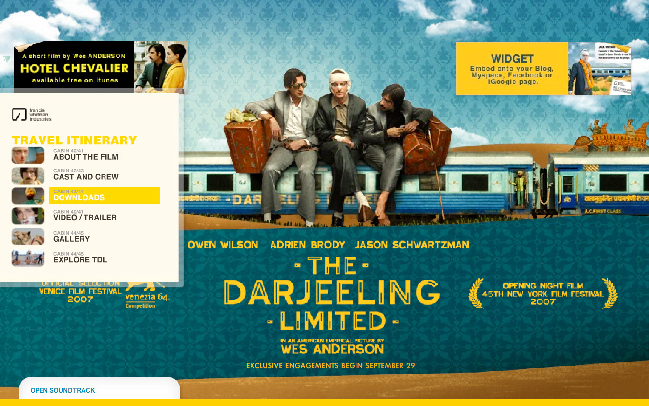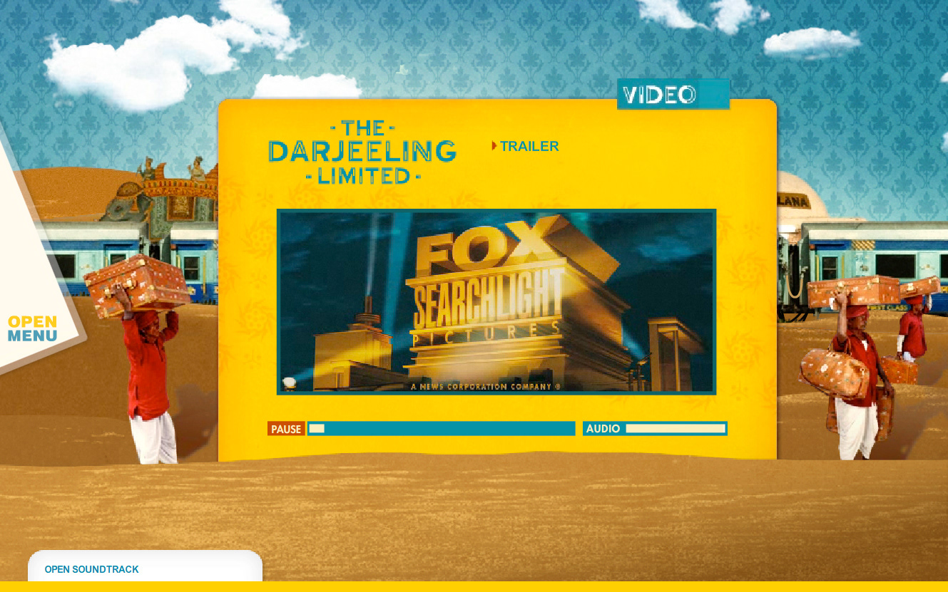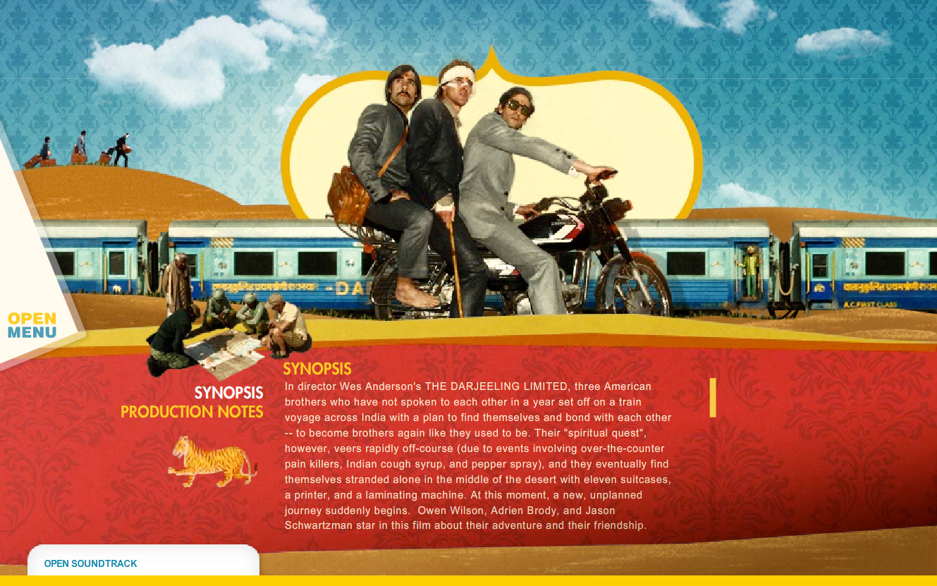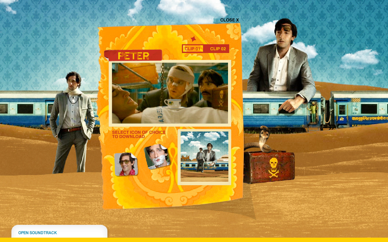 Website design for the Wes Anderson film "The Darjeeling Limited". Developed in conjunction with the film's production company, the releasing studio, the lead agency in charge of the film's release, and the director.