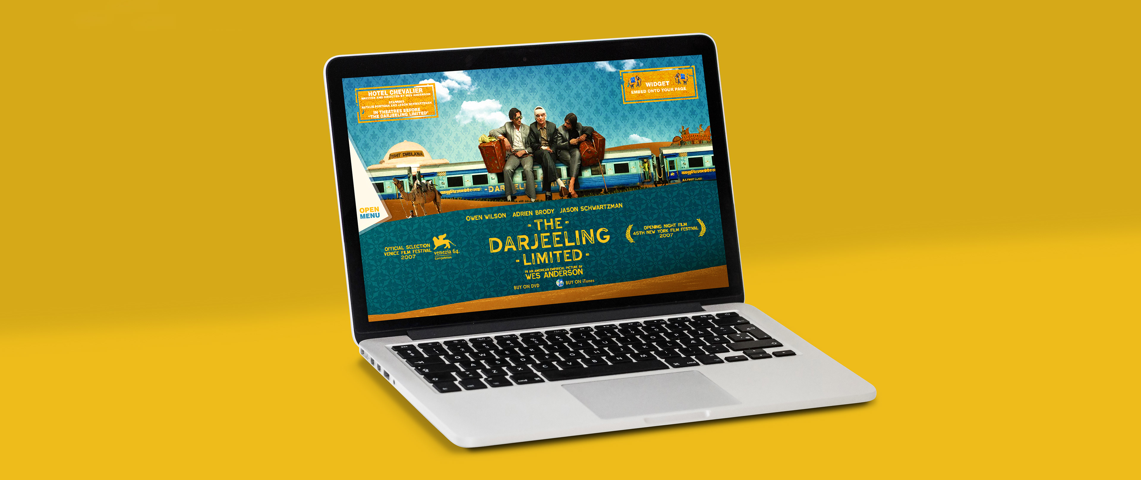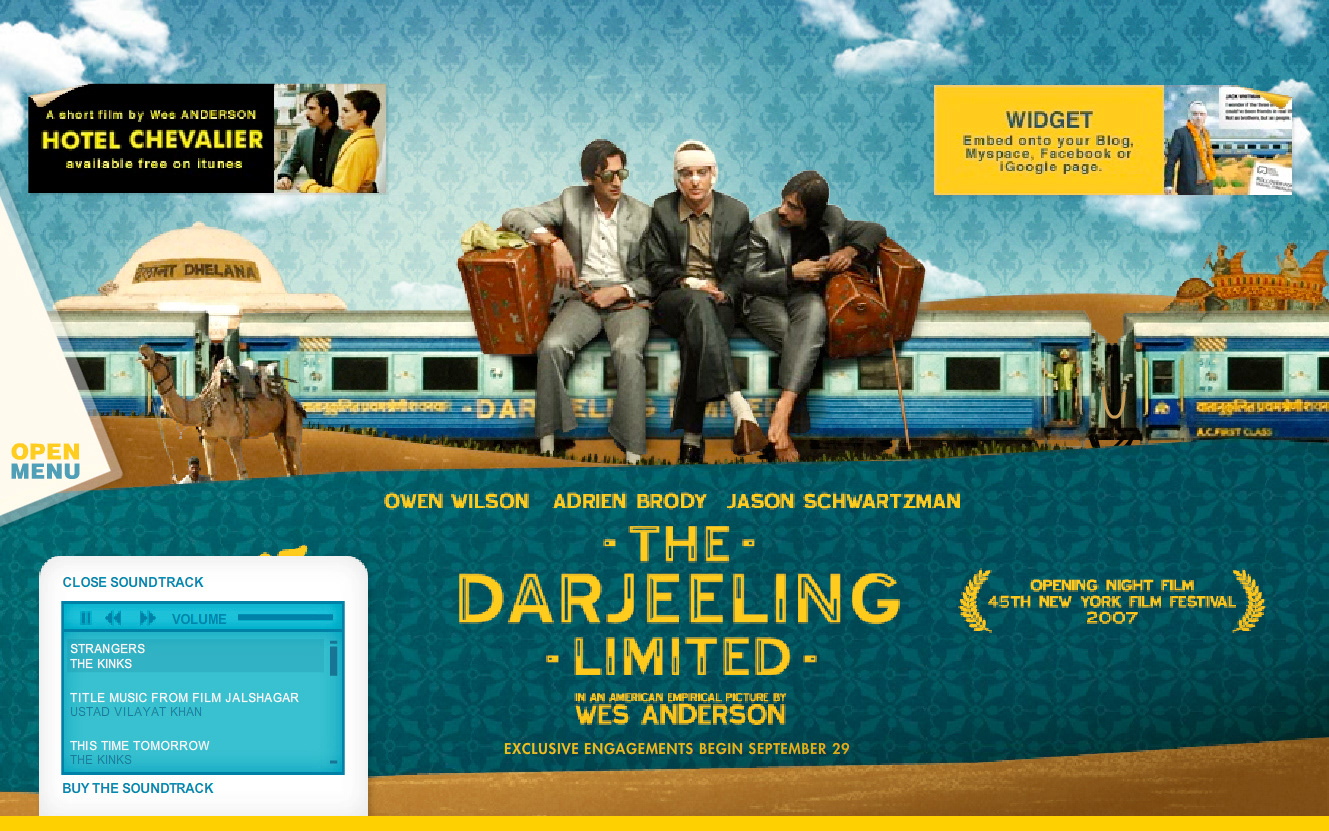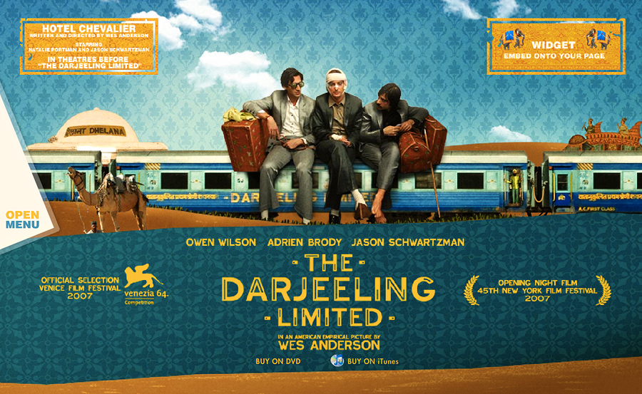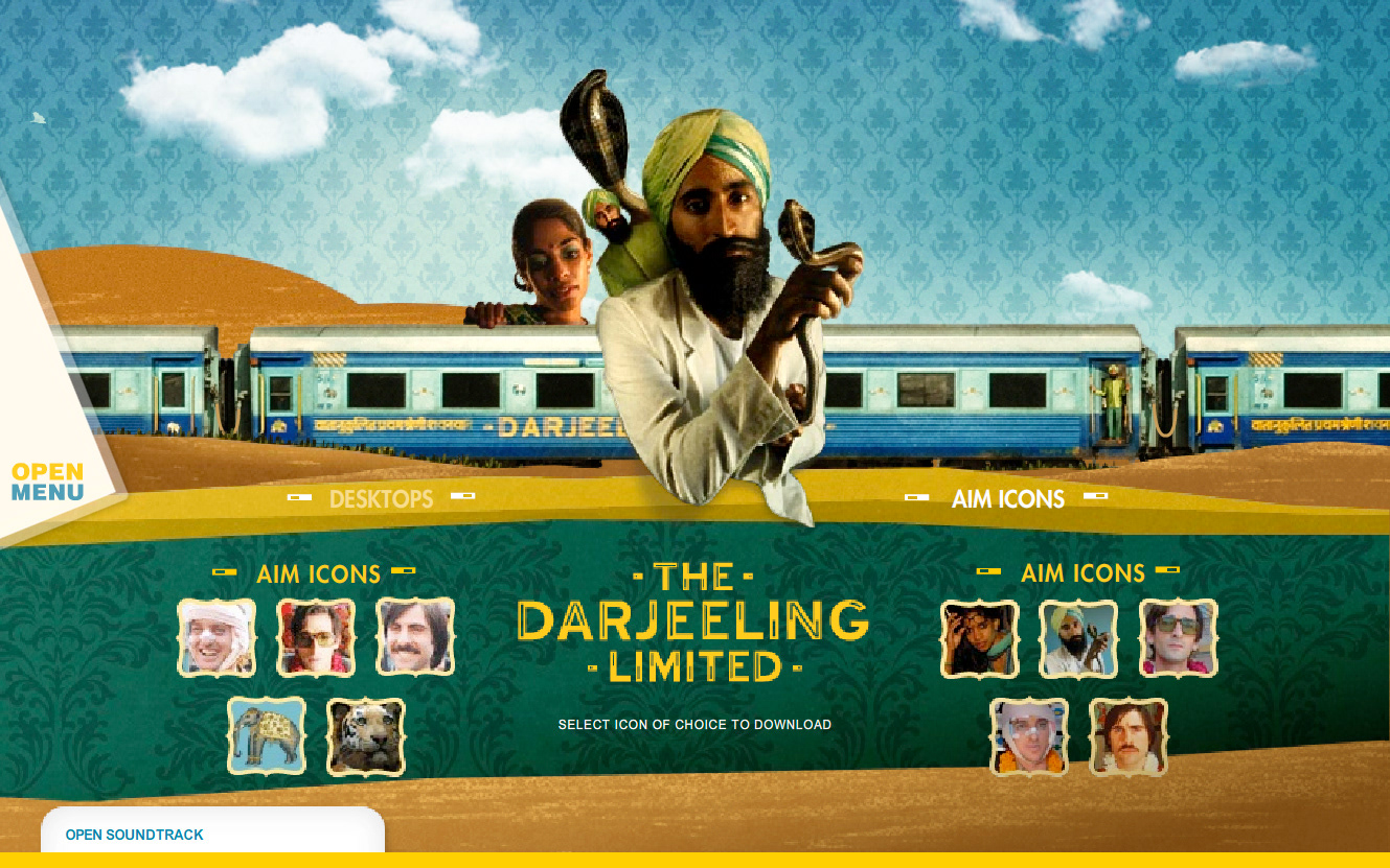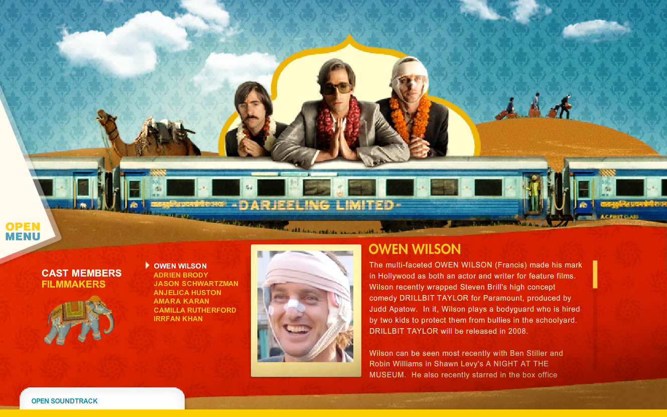 Website design for the Wes Anderson film "The Darjeeling Limited". Developed in conjunction with the film's production company, the releasing studio, the lead agency in charge of the film's release, and the director.